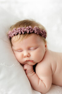 A new mom in a blue dress kisses her newborn baby's head while standing in a field after visiting a toy store in savannah